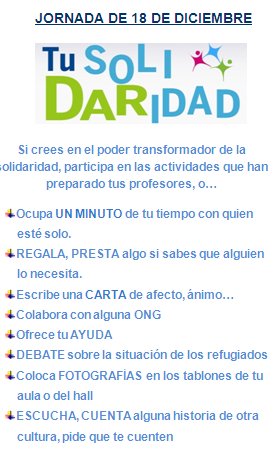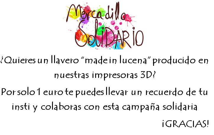 - Por la mañana, se realizará un "Mercadillo Solidario" en el que se venderán llaveros imprimidos con nuestras impresoras 3D, como actividad enmarcada en el Proyecto Gutenberg3D, proyecto de Innovación Educativa en el que participamos junto a 10 centros de toda España. El dinero recaudado será donado a la Fundación NIPACE, de Guadalajara. Agradecer a todos los centros que nos están enviando llaveros hechos en sus impresoras¡¡ GRACIAS AMIGOS!!