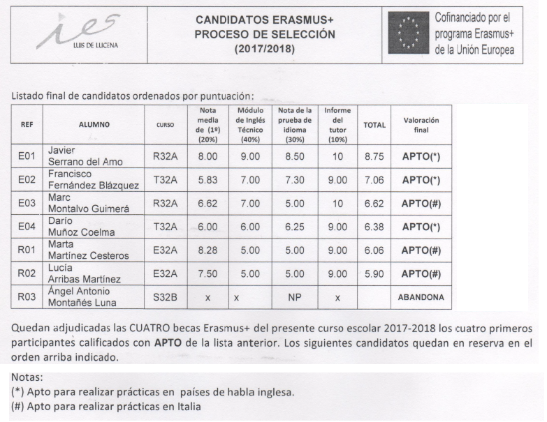 Ya han sido seleccionados los alumn@s para las movilidades Erasmus Plus de educación superior consistentes en ayudas para realizar las prácticas en empresas europeas financiadas por el programa Erasmus de la UE. Aquí os dejamos una captura (el acta oficial está a disposición de los interesados dirigiéndose al Coordinador Erasmus del instituto):