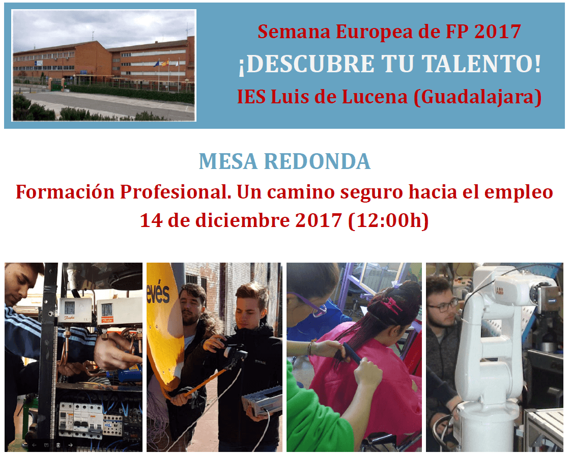 El próximo 14 de diciembre, a las 12h, tendrá lugar en el IES Luis de Lucena una jornada sobre FP, enmarcada dentro de la "Semana Europea de la FP", una iniciativa de la Unión Europea que tiene por objeto hacer más atractiva la Formación Profesional a través de una combinación de eventos que están teniendo lugar en toda Europa, a escala local, regional y nacional.